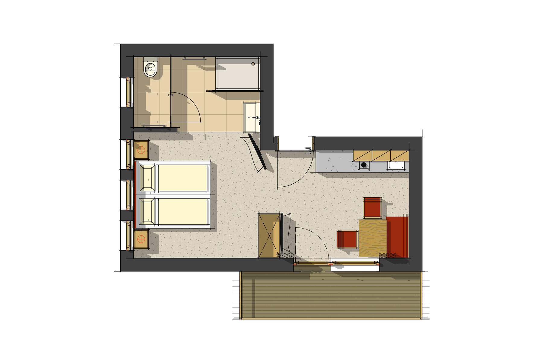 Unser Typ-B-Appartement ist 27 m2 groß und verfügt über eine Wohnküche, einen Schlafraum und ein Badezimmer mit Dusche, Haartrockner und WC.